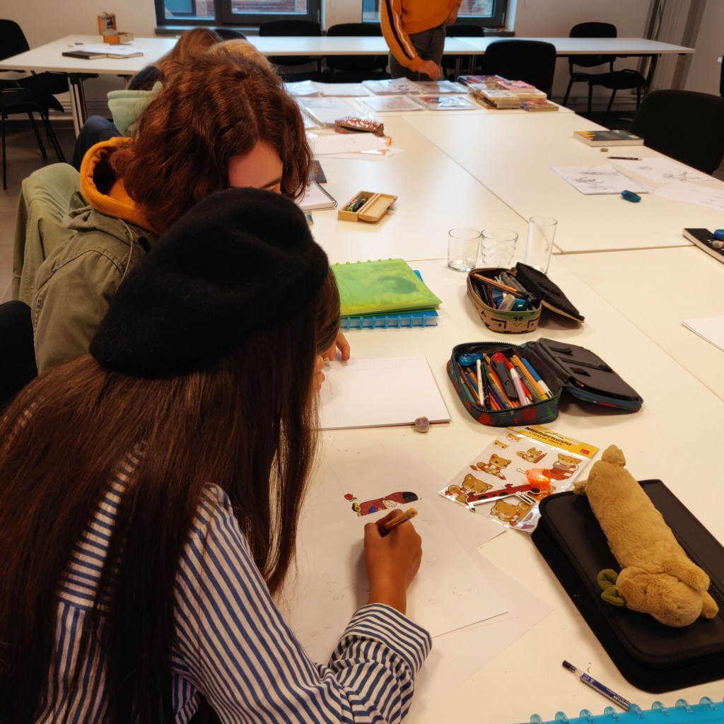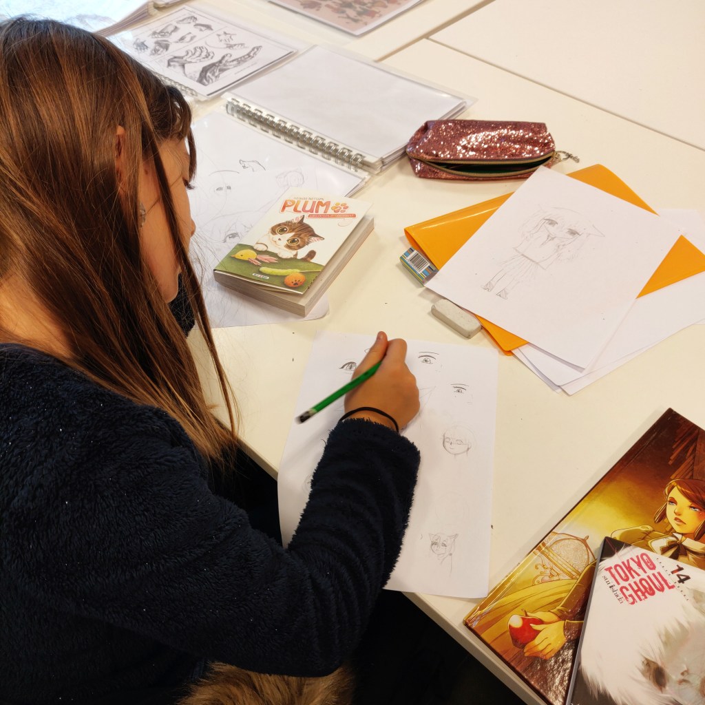 Je pense à Sam avec ses deux premières pages de manga en couleur inspirées de Black Clover. Nalou et ses personnages originaux et hauts en couleurs. Eileen et sa première planche sur Raiponce. Nicolas qui fait de beaux progrès en anatomie et qui commence doucement le scénario de son premier manga shonen. Louise qui est très inspirée par Stranger Things. Diego qui s’entraîne dur dans le style de Naruto, et poste des vidéos de ses dessins sur Tiktok. Olivia et sa passion des chats et de Maliki. Et enfin Mathis qui vient de commencer, et qui comprend très vite!